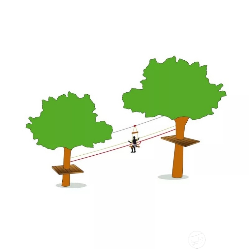 滑索由两个接头组成,通过旋转环连接到滑轮。它们与撑杆原木连接,Ø 16毫米纹理聚丙烯绳索的线条通过