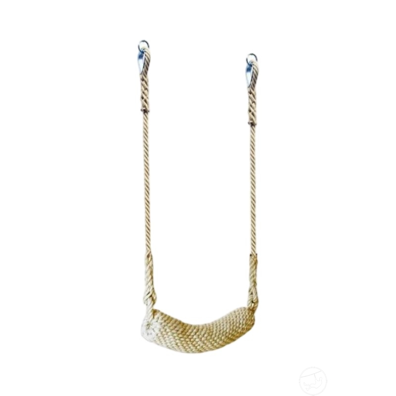 椰子秋千用纹理聚丙烯编织,长60厘米,悬挂于长2.50米的绳索上。其两条线由直径20毫米的纹理聚丙烯制成,带有顶针环和线环。