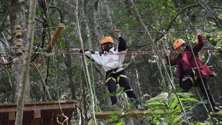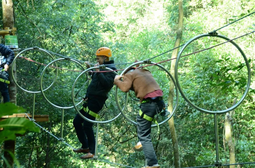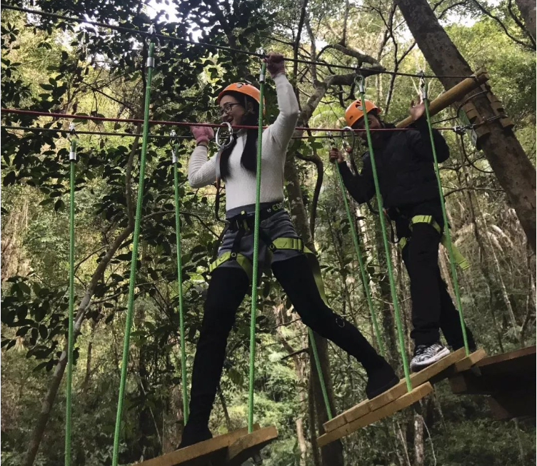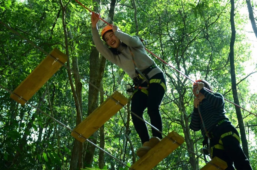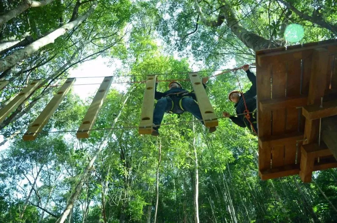 丛林飞越树上探险是目前流行的一种健康的户外休闲探险运动,是一项集冒险、运动、娱乐、挑战于一体的拓展体验项目,它通过在树木间设置并搭建各种难易不同、风格迥异、超强刺激的关卡障碍环节将树木连成一条线路,玩家需要通过悬空桥梁、网道、步道、木桶、秋千、索道和其他趣味环节等方式进行树木间的探险,体验高空坠落与自由滑翔的快感,感受攀爬与穿越的刺激。