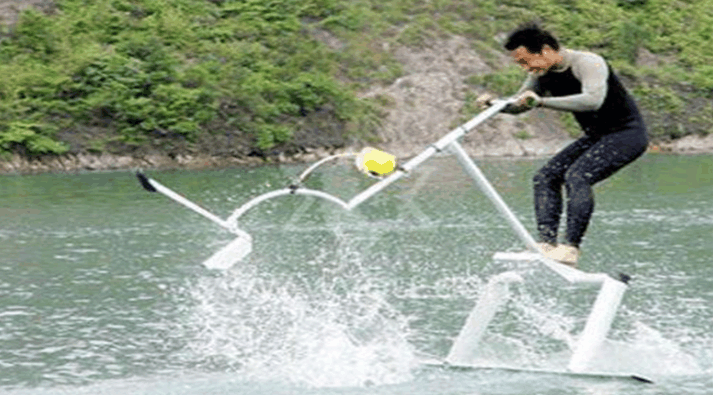 为什么将它称为跳跳车呢,其实如果看到它的使用方法就会自动联想到跳跳车,外形看起来十分简单,后面上冲浪板,看前面又像一个自行车,虽然在中国被称为水上跳跳车听起来有点土气,但在国外人家有一个叫Aquaskipper的洋气名字,这款让你畅游水面的水上飞全身只有12公斤,虽然是冲浪板跟自行车的结合体,但人家就是体重就比自行车轻了好多,并且携带非常方便,虽然看起来体型有点大但是可以拼装。