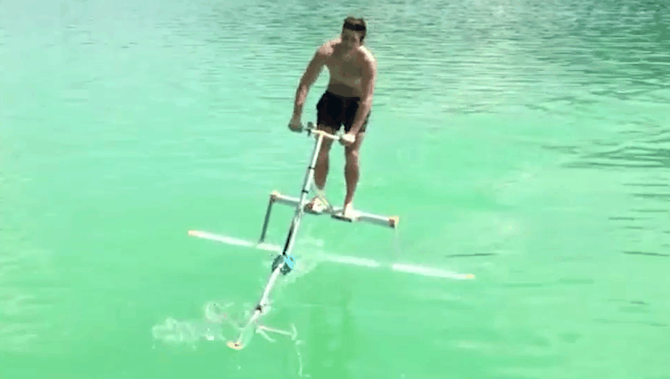 轻功草上飞和轻功水上漂一直是多少人童年的梦想,特别是面对浩瀚的湖面,总想着帅气的如履平地施展一个水上漂就能达到对岸,但估计还没等你飘起来就已经掉在河里成为落汤鸡了,为了满足大家想在湖面行走的好奇心,发明家们就发明了这样一个可以在水面上自由行走的跳跳车。