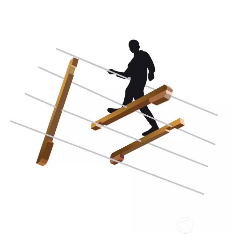 由90 x 90毫米方木椽子制成,采用4级高压釜,安装于两根钢索之间。每把锤子都配有配重,尺寸为1.80米。固定游戏模块需要用钢缆夹。
